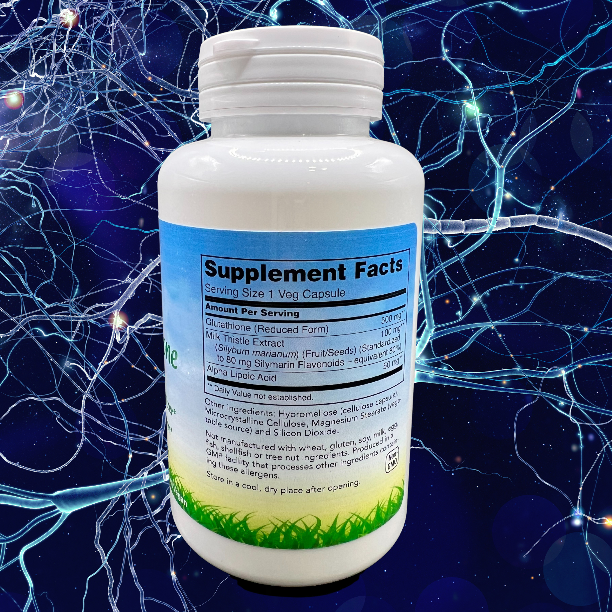 El glutatión es una pequeña molécula peptídica compuesta por tres aminoácidos: cisteína, ácido glutámico y glicina. Es producido por cada célula del cuerpo, con niveles especialmente altos en el hígado.* El glutatión es fundamental para la función saludable del sistema inmunitario y es necesario para los procesos de desintoxicación adecuados.* También juega un papel fundamental en el mantenimiento de la salud celular al neutralizar directamente radicales libres, así como manteniendo la actividad de las vitaminas C y E.* El extracto de cardo mariano y el ácido alfa lipoico se incluyen como ingredientes complementarios.